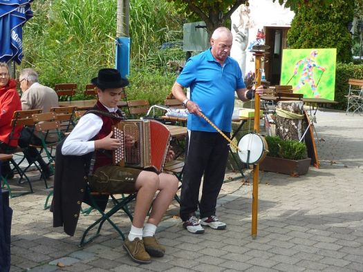 Die Einladung an die Verbandsmitglieder wies auf die malerische und abwechslungsreiche Hügellandschaft der Holledau hin, dem größten zusammenhängenden Hopfenanbaugebiet der Welt, das zum Walken und auch zum Wandern einlädt. Denn rund um Wolnzach gäbe es ein weit verzweigtes Wanderwegenetz zwischen Hopfenfeldern, Wiesen und Weiden. Der berühmteste Wanderweg sei der Hopfenlehrpfad mit einer Länge von 4 km, aber auch die andere geplante Strecke mit 7 km sei gut zu bewandern. Für beide Routen gab es Führer, die die Strecke kannten. Bei herrlichem Spätsommerwetter ging es am Biergarten des Bürgerbräu Wirts, direkt neben der Urban Chestnut Brauerei und dem Museum „Kulturgeschichte der Hand“ auf die Strecke. Und damit es beim Mittagsessen nach der Walking-Tour auch gemütlich wurde, spielten die beiden Musikanten Michi und Rudi zünftig auf.