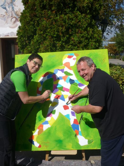 Sabine Mann und der 2. Vorsitzende Bezirk Oberbayern, Herr Hofmeier bei der kleinen Kunstaktion