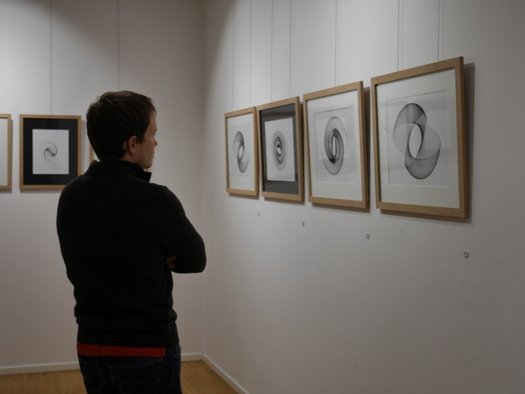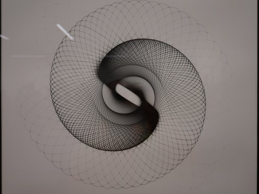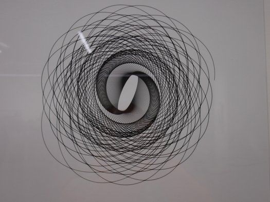 Dabei herrscht im Labor des Künstlers alles andere als Ruhe, mittels einer Lichtquelle, die in gezielten Pendelbewegungen durch den Raum schwingt, erzeugt er auf speziellem Fotopapier rein mathematische Muster. Selbst gemischte Chemie bringt im Entwicklungsprozess, die Spuren von Pendel und Schwerkraft ans Tageslicht.