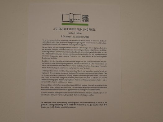 Eine wunderbare Ausstellung hat der Passauer Herbert Hafner, in die Städtischen Galerie Pfaffenhofen gezaubert. Seine ungewöhnlichen Arbeiten ohne Film und Pixel, beeindrucken ob ihrer Klarheit und Ruhe.