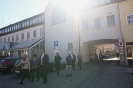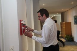 „Mainburg ist nach Pfaffenhofen die zweitgrößte Geschäftsstelle“, erklärt Sylvia Plenagl. „Aus diesem Grund ist es wichtig, dass das Gebäude im Ernstfall schnell und sicher geräumt werden kann“, fügt sie weiter an. Vier Minuten ist die vorgeschriebene Zeit für die Evakuierung, die aber anders als in Pfaffenhofen – dort gibt es, wie Heinz Böhm erläuterte, eine zentrale Brandmeldeanlage – manuell ausgelöst werden musste. Einmal kräftig in den Brandmelder pusten und zwar in jedem Stockwerk. Sofort wenn das Alarmsignal zu hören ist soll nicht nur das Gebäude unverzüglich verlassen, sondern auch im jeweiligen Stockwerk noch einmal in den Brandmelder geblasen werden.