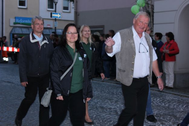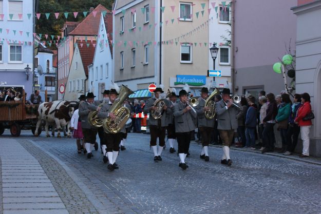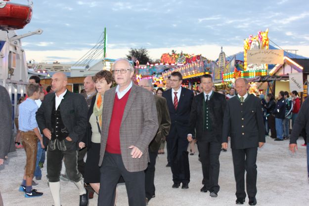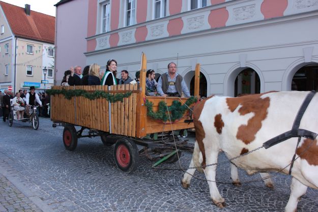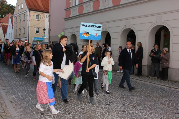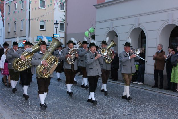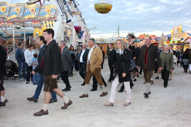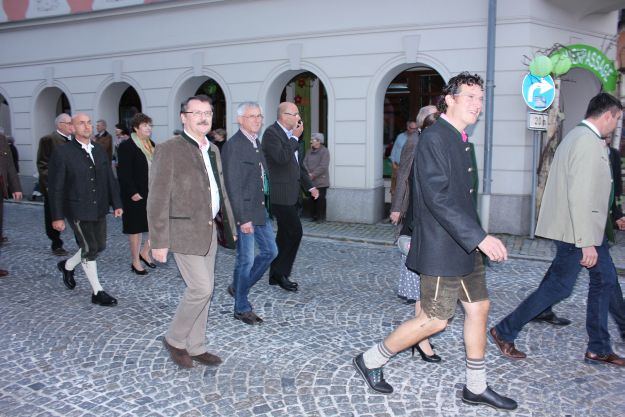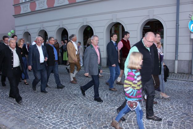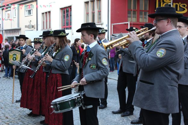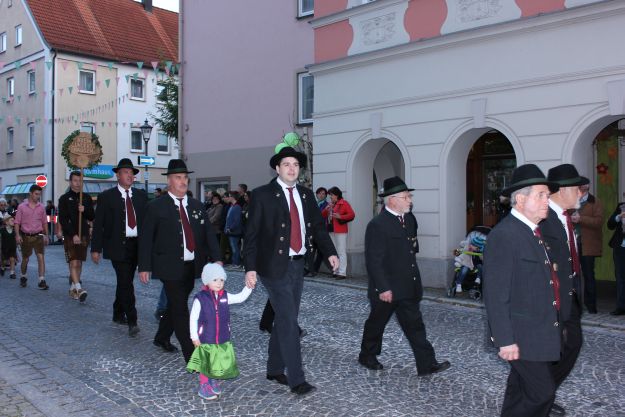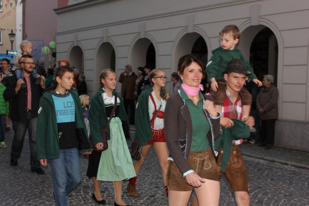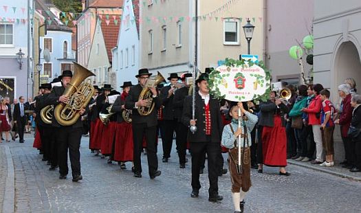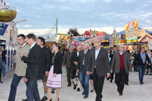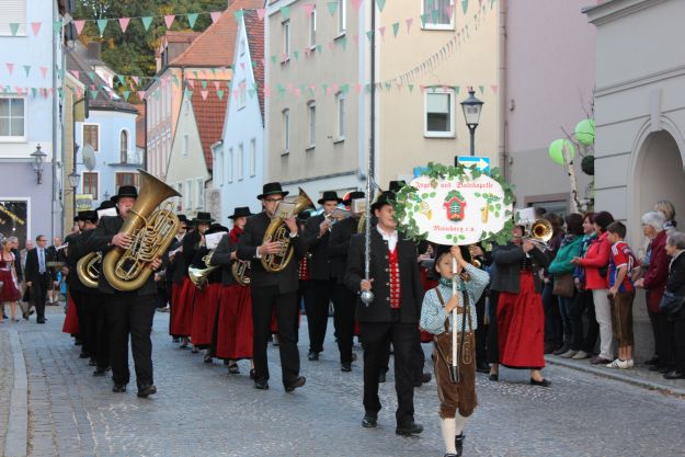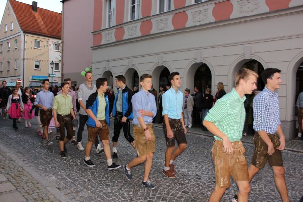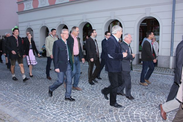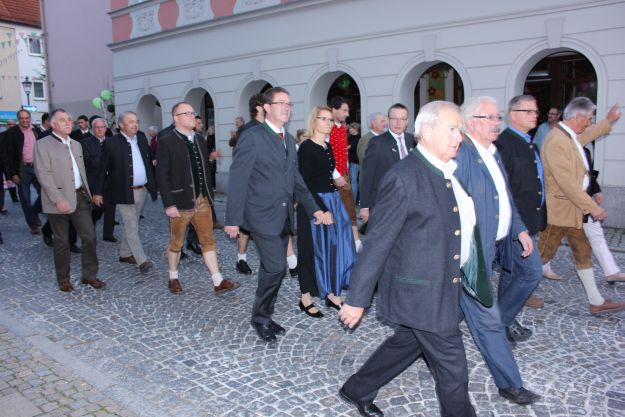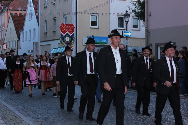 Am Auszug beteiligten sich auch heuer wieder zahlreiche Vereine, wobei die letzten ins Bierzelt kamen, als die ersten ihre Maß schon wieder ausgetrunken hatten - so viele waren es. Zuvor war der Aufmarsch zum Standkonzert vor dem Rathaus mit der Jugend-und Stadtkappelle Mainburg, der Marktkappelle Au und dem Spielmannszug Högertshausen. Danach schlängelte sich der Zug bestehend aus Ehrengästen, Brauereivertretern und Festwirten in Richtung Schöllwiese. Nach dem Bieranstich startete die Zeltparty mit dem „Froschhaxn Express“.