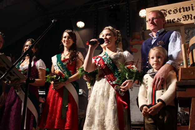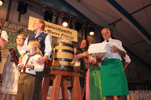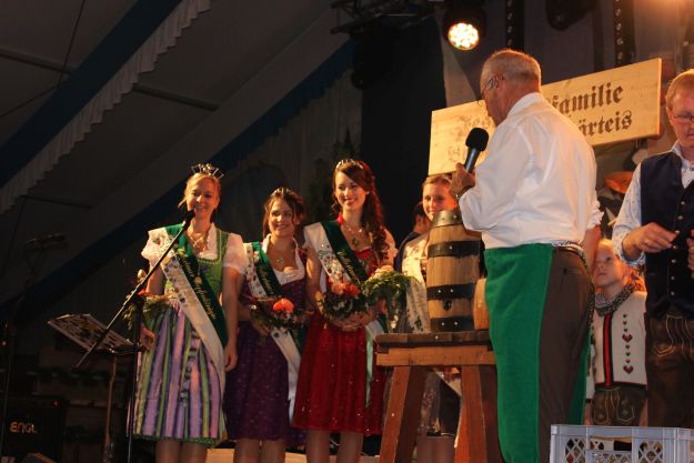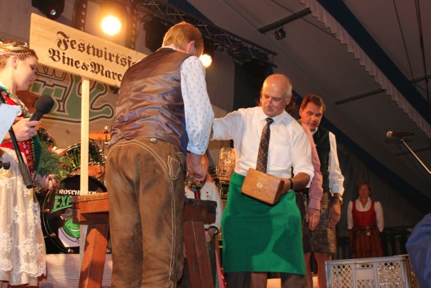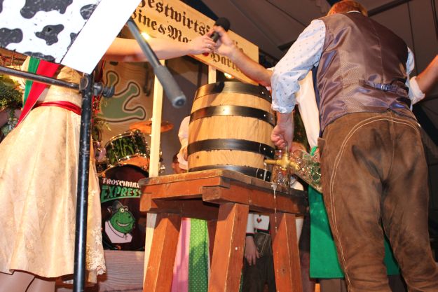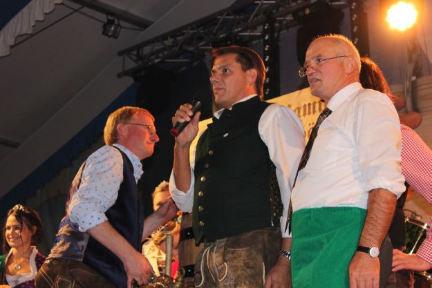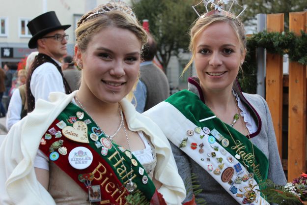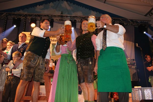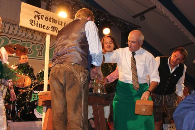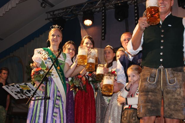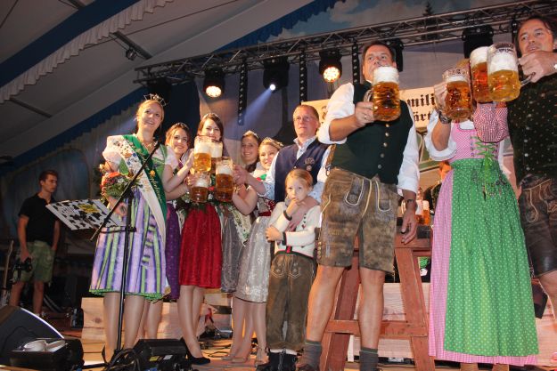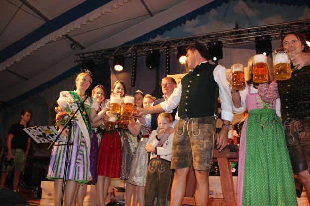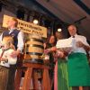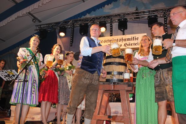 Gleich sage und schreibe neun Schläge brauchte Sepp Reiser, bis er im Dausinger Festzelt den Gallimarkt als offiziell eröffnet deklarieren konnte. Und am Ende konnten alle glücklicherweise von einem Schaumbad verschont bleiben. Es würde auf ein kräftiges „Prosit der Gemütlichkeit“ angestoßen und alle wünschten sich „an guadn Hunger, an guadn Duascht und a boor scheene Dog“ auf dem Hallertauer Oktoberfest. Die beiden Festwirte Peter Schöniger und Marco Härteis richteten ebenso ihre Grußworte an das Biervolk wie das Hallertauer Hopfendreigestirn. Zu den drei Hoheiten gesellten sich daneben Bierkönigin Sabine Schalk sowie die Siegenburger Hopfenkönigin Monika Haindl.