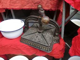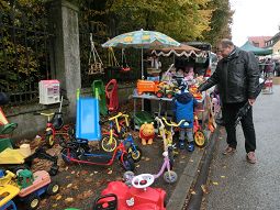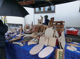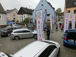 Auch die Besucher kamen nur sehr zögerlich, mit Schirmen bewaffnet, und schlenderten zwischen den einzelnen Ständen. Heiß begehrt waren Kirchweihnudeln und - striezeln, heiße Maroni und andere kulinarische Angebote, wie Käse, Wurstspezialitäten und Liköre. Neben uralten Flohmarktsachen aus Großmutter´s Zeit gab es aber auch modernes Spielzeug für die Kids, Kleidung, Schmuck, Geschirr und Dekoration. Allerdings nicht zu vergleichen mit anderen Märkten in Au, wenn das Wetter mitmacht. Der ganze Marktplatz war für die Autohändler reserviert, am hinteren Ende war ein Bungeetrampolin für die Kinder aufgebaut, das aber leider nicht genutzt und bald wieder abgebaut wurde, der Tierschutzverein Hallertau war wieder mit einem Stand vertreten, wo allerlei Selbstgemachtes angeboten wurde, außerdem gab es einen Überschlagssimulator von der Verkehrswacht Moosburg, wo sich ganz Wagemutige auf den Kopf stellen lassen konnten. Gut besucht war Dank des Wetters auch der Pfarrsaal, wo es Kaffee und Kuchen gab, der Erlös kommt der Renovierung der Kirche in Haslach zugute. In einer Infotafel wurde dargestellt, wie der Renovierungsfortschritt vonstatten geht.