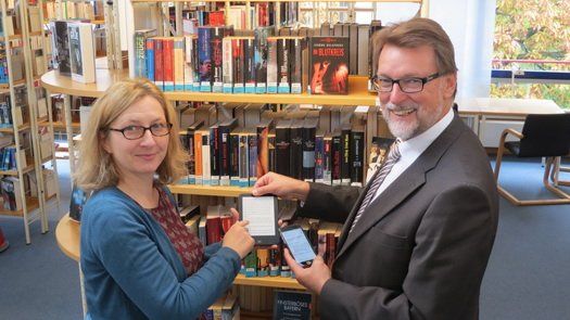 Landrat Martin Wolf und Büchereileiterin Elisabeth Zeidler beim Testen der Onleihe.