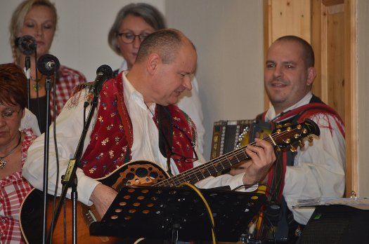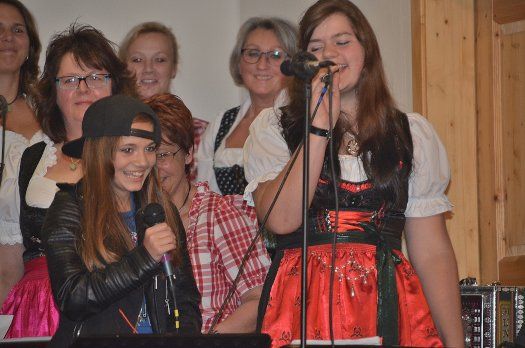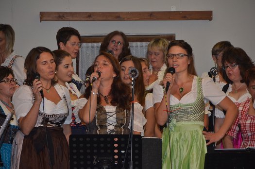 Der Saal war bis zum letzten Platz gefüllt und ebenso die Bühne, wo sich 27 Sängerinnen in aller Enge vor den Mikrofonen drängten; hinzu kamen als „Steirer Wahnsinn“ kurz vor der Pause noch Otto Krammer und Aleksander Pacek, der ist übrigens seit 14 Jahren Weltmeister auf der Steirischen Harmonika. Im Zusammenspiel ergab das eine fetzig, fröhlich Mischung mit vielen bekannten und beliebten Rhythmen. Kristine Steinhart führte als Moderatorin, Tonangeberin aber auch Solistin mit lockerem Mundwerk durch den abwechslungsreichen Abend. Die Bayernhymne war als Auftaktstück zwar etwas eigentümlich, aber damit war der etwas offiziellere Teil auch gleich absolviert.