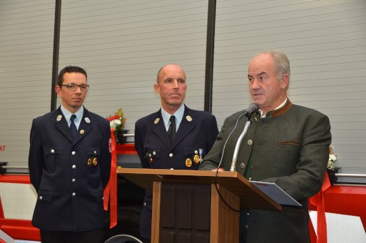 Die Grußworte der Gemeinde sprach Reichertshofens Zweiter Bürgermeister Adolf Kothmeier (r.) im Beisein vom Ersten Kommandanten der Langenbrucker Feuerwehr Jürgen Wolkenstein (Mitte) und seinem Vizekommandanten Martin Weber.