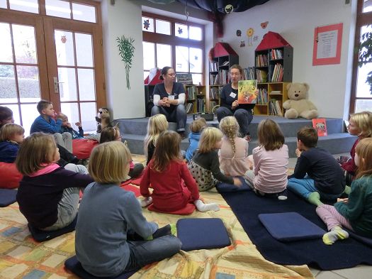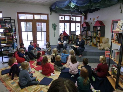 Bianca Konzack und Astrid Hötte, die ehrenamtlich in der Bücherei arbeiten, hatten auf Decken und mit Sitzkissen alles liebevoll vorbereitet. Nach einer kurzen Einleitung zu dem Stück und dem Komponisten Camille Saint-Saens wurden immer wieder Passagen der musikalischen Suite für Kammerorchester auf dem CD Player vorgespielt, dazu die passende Stelle vorgelesen und auch erklärt, was man da hören kann, wenn man genau hinhört: Das Brüllen der Löwen, das Kreischen der Affen und vieles mehr. Ganz fasziniert folgten die Kinder der Geschichte. Auf spielerische Weise werden so klassische Meisterwerke den Kindern nahe gebracht.