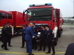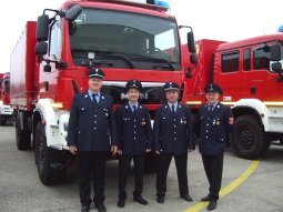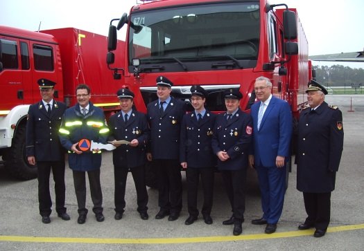 Eine kleine Abordnung (Daniel Betz, 1. Kommandant Michael Wagensonner, 2. Kommandant Stefan Bauer und 3. Bürgermeister Gerhard Betz) der Hopfengemeinde war am Samstag zur offiziellen Übergabe auf dem Gelände der Firma Airbus Defence and Space in Manching gefahren, um das Fahrzeug von Bayerns Innenminister Joachim Herrmann sowie von Christoph Unger, Präsident des Bundesamts für Bevölkerungsschutz und Katastrophenhilfe, in Empfang zu nehmen. Mit einer Urkunde dokumentierten die Behörden die Übergabe des Fahrzeugs als „bundeseigene Ausstattung“ an den Markt Nandlstadt. Der Innenminister nutzte die Fahrzeugübergabe, um auch die Arbeit der Aktiven zu würdigen: „Das Herzstück, das sind die vielen ehrenamtlich engagierten Helferinnen und Helfer, die bereit sind, Dienst im Bevölkerungsschutz zu versehen. Der Bund leistet mit seinen Fahrzeugen einen Beitrag zur Unterstützung dieses Engagements“, sagte Herrmann vor den rund 400 Teilnehmern aus den bayerischen Hilfsorganisationen und Feuerwehren.