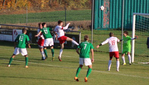Früher Führungstreffer für den TSV Jetzendorf: David Vohberger (Nr. 17) trifft per Kopf