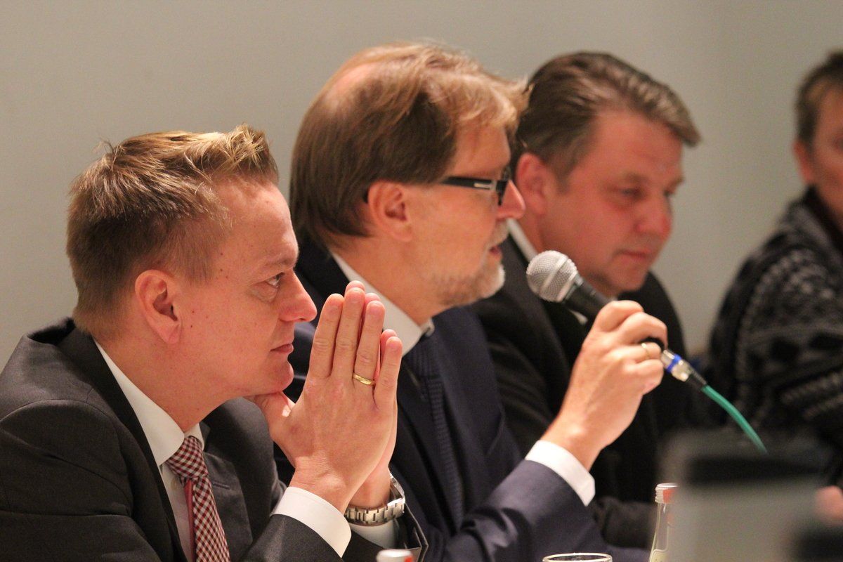 Landtagsabgeordneter Karl Straub, Landrat Marin Wolf und Bürgermeister Jens Machold bei der Bürgerversammlung in Wolnzach