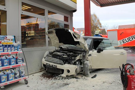 Von der A93 aus Richtung Regensburg kommend, fuhr eine Frau mit ihrem Auto der Marke Mini um 14.13 Uhr die Autobahnausfahrt Wolnzach die leicht abschüssige Straße hinab. Aus noch ungeklärter Ursache bremste sie nicht ab, sondern fuhr mit hoher Geschwindigkeit über die Preysingstraße, krachte zunächst gegen einen Laternenmast und stoppte erst an der Wand der dortigen Tankstelle.