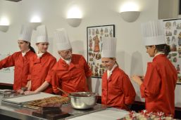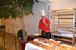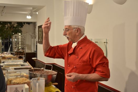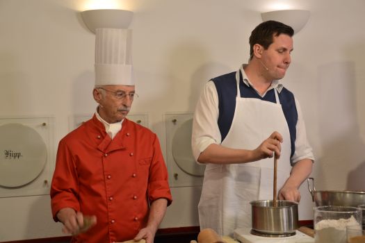 Die Mitarbeiterinnen und Mitarbeiter aus dem Konditorreibereich im zweiten Stock des Hauses waren chic gekleidet und trugen ihre hohen Konditormützen mit Stolz, während sich Hans Hipp noch einmal vor Beginn der Veranstaltung die Ruhe gönnte, seinen vorbereiteten Text durchzugehen, denn es sollte bei der Präsentation bloß nichts schief gehen. Vorher waren alle Zutaten aufgebaut, die Schokolade wurde auf einer warmen Platte laufend kräftig gerührt, damit sie flüssig bleibt sowie der Teig vorbereitet, der zum Reifen in der Regel 6 Monate liegen muss.