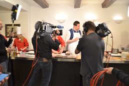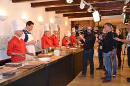 Die Beleuchter traten in Aktion, Kabel wurden hinterher gezogen, und der Moderator Flasskamp und Hans Hipp erläuterten vor zwei laufenden Fernsehkameras den Produktionsprozess sowie die Geschichte der Lebzelter. Dieses Handwerk wird im Hause Hipp seit 13 Generationen ununterbrochen ausgeübt und die Modeln (die Holztafeln für die Figuren der Lebkuchen) sind teilweise bis zu 400 Jahre alt und können auch im kleinen Museum des Café Hipp bestaunt werden.