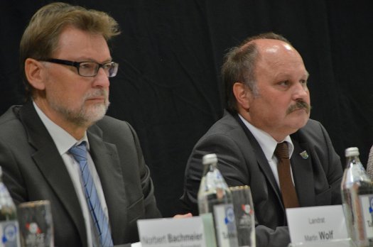 Stellten sich den Bürgerfragen zur Flüchtlingsproblematik: Landrat Wolf (l.), Bürgermeister Wayand.