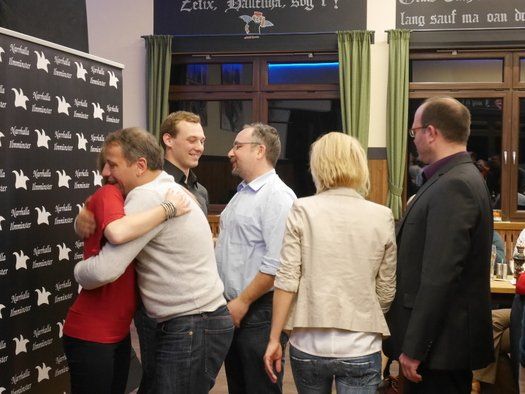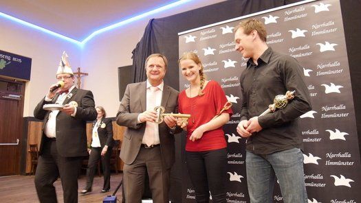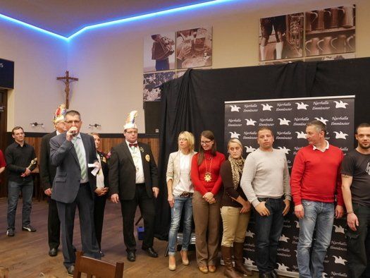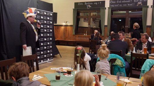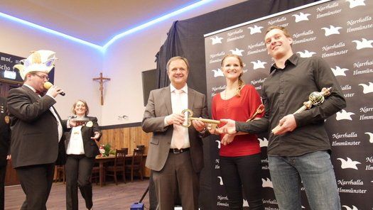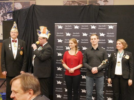 Narrhalla-Präsident Martin Schlicht hatte sich für die Proklamation im Gasthof Schrätzenstaller zu Hettenhausen, der „homebase“ der ehrenwerten Faschingsgesellschaft, ein durchaus aufwendiges Ausschlussverfahren einfallen lassen. Wer bestimmte Kriterien erfüllte, Vollbad, nein es heißt Vollbart, Mitglied im Elferrat, schwanger( erstaunlich), Feuerwehr ufA, durfte sich wieder setzen. Es blieben drei Paare übrig, die mit viel Rauch und Stroboskobgewitter, nach und nach, vor die kleine Bühne traten. Übrig blieben wie oben erwähnt, Bettina I. und Stephan III., die nach dem feierlichen Erhalt ihrer Zepter, nebst Diadem für die Prinzessin, auch noch den symbolischen Schlüssel für die Gemeindekasse von Bürgermeister Anton Steinberger erhielten.