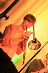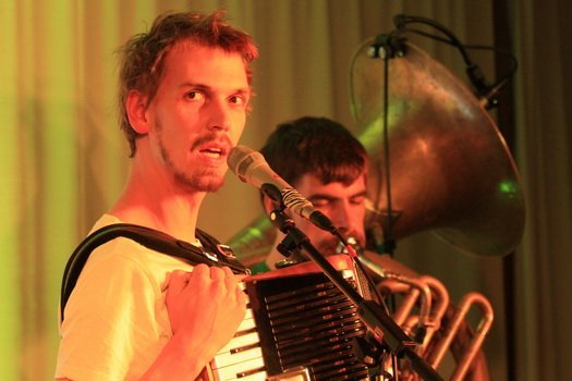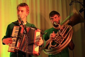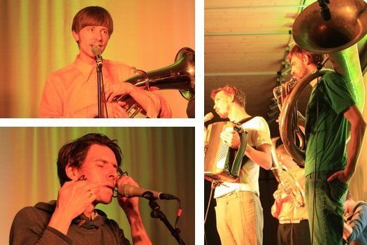 Bewaffnet mit einem Arsenal landestypischer Instrumente zogen sie ins Feld und spielten Lieder, nach denen sich ein Rosenmüller für seine Filme die Finger ablecken würde. Viel Moll, wechselnde Harmonien und Rhythmen, lange instrumental-Teile… gerade auch durch den tiefen, durchdringenden Ton der Helikontuba erschafft die Band einen satten Sound, der einhüllt und nicht mehr loslässt. Melancholisch mitunter. Die kurze Stille zwischen den Liedern irritiert, sobald der Bass nicht mehr im Körper vibriert und die Rhythmen stehen bleiben. So bayrisch-minimalistisch und staubtrocken die Musiker ihre zum Schreien komischen Zwischenmoderationen abliefern, so hochkonzentriert-tiefenentspannt lassen sie sich auch beim Spielen nicht draus bringen: Sowohl instrumental als auch an den Mikrophonen setzen sie derart gegenläufige Themen zusammen, dass jeder Zuschauer sich denkt: „Wie kommt man denn da nicht durcheinander?“, „Müssen die denn gar ned atmen?!“ und entsprechend für frenetischen Zwischenapplaus sorgt.