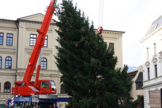 Der Christbaum für dieses Jahr wurde jetzt auf dem Oberen Hauptplatz aufgestellt. In der Innenstadt spürt man immer mehr vorweihnachtliche Stimmung: Nachdem der Christkindlmarkt fast fertig aufgebaut ist und die Straßenbeleuchtung aufgehängt wurde, beeindruckt der prächtige Baum nun auf dem Kirchplatz.
