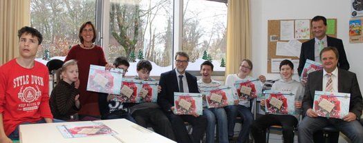 Über je einen Adventskalender des Lions Clubs Pfaffenhofen/Hallertau können sich die rund 60 Klassen und Gruppen des Heilpädagogischen Zentrums in Pfaffenhofen und Geisenfeld freuen. Landrat Martin Wolf überreichte die Kalender gemeinsam mit Vertretern des Fördervereins an die Kinder und Jugendlichen der Adolf-Rebl-Schule.