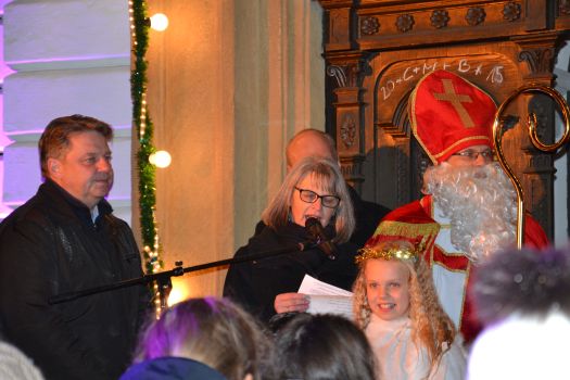 Um 17 Uhr war es dann soweit, Bürgermeister Jens Machold zählte mit den Kindern den Countdown herunter, die Scheinwerfer flammten auf und tauchten das Rathaus in bunte Farben, die Kerzen am großen Christbaum gingen an sowie die Weihnachtsbeleuchtung und Bürgermeister Jens Machold begrüßte die zahlreichen Gäste und überließ dann Marktgemeinderätin Astrid Elender das Feld, die durch das Programm des Abends führte. Die Marktkapelle spielte auf und die kleinen Kinder, die nicht nur die Beine der Erwachsenen sehen wollten, durften auf den Schultern der Papas sitzen, um richtig sehen zu können, was denn so vor der Rathaustreppe alles geschah. Astrid Elender las kleine Geschichten vor und animierte zum Mitsingen und die Mädchen der Tanzschule Saphira führten mit bunten Tüchern einen Lichtertanz auf. Als dann gegen Ende der Nikolaus mit seinen Engeln Adventskalender als Geschenke verteilen wollte, musste Astrid Elender die Eltern bitten, ihre Kinder etwas zurückzuhalten, damit sie nicht am Geländer der Rathaustreppe zerdrückt werden, denn der Nikolaus hatte für jedes Kind etwas dabei.
