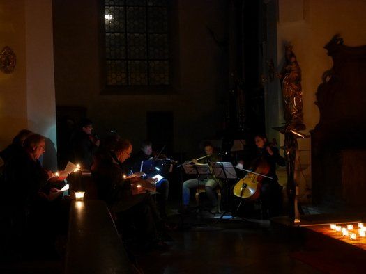 Nach einem gesungene Gebet des Franz von Assisi, einem Psalm kam eine Lesung aus der Genesis/1. Buch Mose. Mit feiner musikalischer Begleitung, ganz stark Cellistin Marie-Therese Daubner, bewegte sich die Taizé - Andacht auf eine zehnminütige, absolute Stille zu. Dieser Part ist die Seele des Abends, hier kann jeder sich selbst erfahren, sich leeren, oder sammeln, kein störender Laut war in diesem Jahr zu vernehmen.
