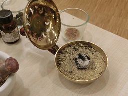 Die verschiedenen Räucherobjekte wurden in einer Schale unter den Zuschauern herumgereicht, jeder konnte probieren, welcher Geruch einem am besten zusagt. Dazu gab es auch noch die fachmännische Erklärung, zu welchem Zweck welcher Ausgangsstoff am besten geeignet ist.