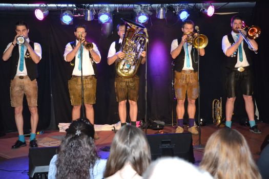 Auch neuzeitliche Themen griffen sie in ihren Liedern auf, wie die Superküchenmaschine ThermoMix, mit der sich einfach alles machen lässt, die sogar als Betonmischmaschine herhalten könnte. Sie schafften es auch, das Publikum mit einzubinden, wenn es darum ging, zum Lied über das fehlende Bier im Kühlschrank ("ja da sauf i gleich a Flasche Wein“) die abgewandelten Tanzschritte des Songs „Macarena „ zu machen. Dafür kassierte das Publikum dann auch gleich ein Lob „Ja ihr Pfaffenhofener, ihr seid gut, in München haben´s nicht geschafft“. Und bei der gesungenen Kontaktanzeige zeigten sie, dass sie auch keine Scheu hatten, sich einmal zu verkleiden. Einfach ein herrlicher Spaß mit diesen fünf Musikern und ihren Blechinstrumenten, die sich schon seit ihrer Jugend kennen und bereits als Schülerband zusammen waren: Dominik Glöbl und Christian Striegl (Trompete), Michael Wallner (Basstrompete), Franz Eisenschink (Posaune) und Josef Haslinger (Tuba).