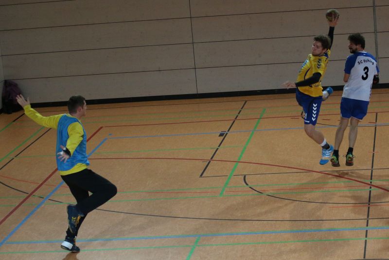 Die Gäste aus Eching waren als Tabellenzweiter mit einer gehörigen Portion Ehrgeiz in die Sporthalle des Pfaffenhofener Gymnasiums angereist; erklärtes Ziel war es, an Ort und Stelle zum Spitzenreiter der Handball-Bezirksliga aufzuschließen. Jedoch schienen sie hin und wieder übermotiviert, schlugen dabei auch das eine oder andere Mal über die Stränge und mussten dementsprechend oft in Unterzahl spielen. Der MTV wusste dies zunächst zu seinen Gunsten zu nutzen und baute sich in der ersten Halbzeit konstant eine 2-Tore-Führung auf, obwohl man auf Seiten des Gastgebers des Öfteren die Angriffe nicht konsequent genug zu Ende spielte und es darüber versäumte, den Abstand schon frühzeitig auszubauen. Gegen Ende der ersten Halbzeit konnte das Team des SC Eching schließlich wieder aufschließen, so dass es mit einem 15:15 Unentschieden in die Pause ging.