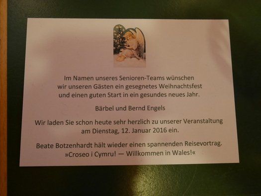 Der Eintritt war frei. Spenden zugunsten des Fördervereins des evangelischen Gemeindezentrums, wurden gerne und vielfach entgegengenommen. Weihnachten kann also kommen, auch wenn sich das oft zitierte, eiskalte Wetter nicht recht einstellen will. Zumindest innerlich gewärmt und gut mit Kultur versorgt gehen jetzt auch die Senioren in die verdiente Winterpause.