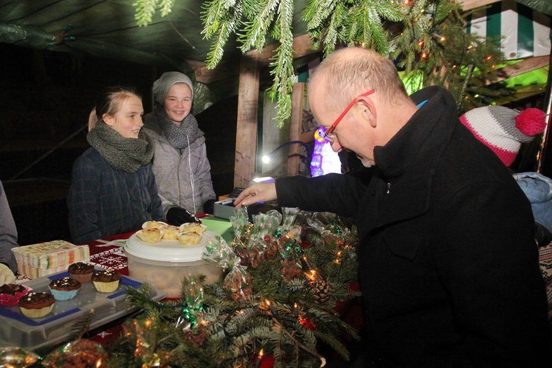 Es war kurz vor 17 Uhr, die Sonne war gerade hinter dem Horizont verschwunden, und die Schülerinnen und Schüler vieler Klassen legten letzte Hand an ihre Stände. Ein herrlicher Duft von Glühwein, Kakao und weihnachtlichem Gebäck lag in der Luft, fehlten nur noch die Besucher. Und die ließen nicht lange auf sich warten, so war der rot-gold erleuchtete Pausenhof schon kurz nach Fünf gut gefüllt, sodass an den einzelnen Ständen reger Betrieb herrschte.