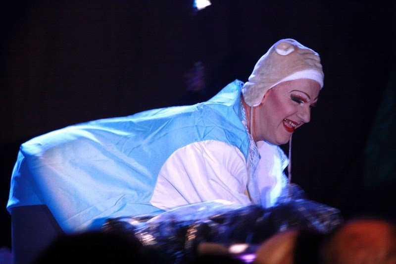 Da gilt es zunächst natürlich die Sicherheitsvorkehrungen zu überprüfen – man weiß ja nie! Die sorgsame Mama der Truppe, Ulknudel vom Dienst und gebürtige Pfaffenhofenerin Jaqueline Mattel kümmert sich darum und beruhigt gleichzeitig die Anwesenden: „Muasst ned schüchtern sei, die Mutti beißt ned.“ Mit Sinn für Ästhetik und Platzierung der Requisiten („Sigt ma mi no oder verdeckt mi der [Mikroständer]?“) führt sie durchs Programm und sche***, pardon, schert sich um nichts. Ob im Babydress über die Bühne robbend oder zungenversiert jodelnd, die Jaqueline gibt Vollgas. Vor lauter Gaudi und ein bisschen Schadenfreue haut es da das Publikum vor Lachen fast von den Stühlen, als in der zweiten Hälfte einige Männer in der praktischen Mittelreihe geballte Fraulichkeit abbekommen.