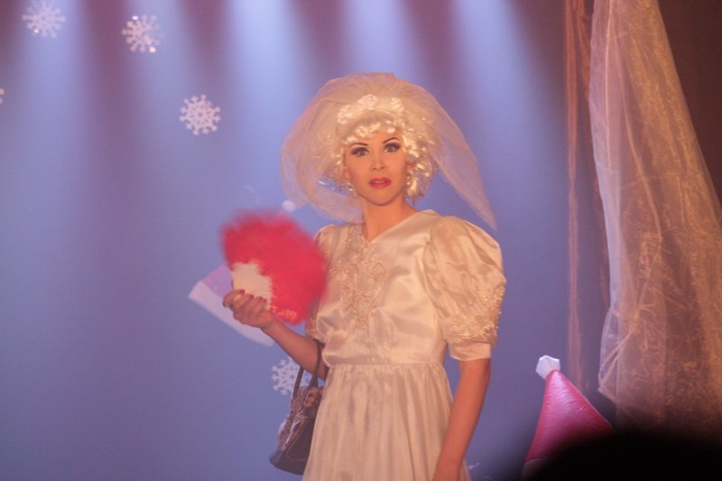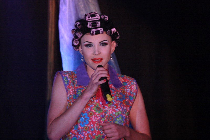 Ebenfalls noch am Karrierenanfang steht die junge, bildhübsche Carmen Cyrus Night, an deren Bühnenperformance die Mutti viel mitgefeilt hat, und das Ergebnis lässt sich sehen. Zum Schreien komisch mokiert sie sich über ihren Mann, wenn der sagt „das bisschen Haushalt ist doch kein Problem“, oder stapft im Brautkleid durch die Reihen der sie verschmähenden Männer – da gibt’s schon mal den Fächer auf den Deckel. Dass man an Carmens Auftritt hat feilen müssen glaubt man kaum, so sicher bewegt sie sich auf der Bühne – pures Entertainment.