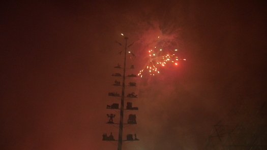 Die gute Stube der Kreisstadt verwandelte sich innerhalb von Minuten, in ein pyrotechnisches Gesamtkunstwerk. Rauch stieg in den sowieso schon diesigen Himmel auf und gespenstische bunte Schattenspiele machten den nächtlichen Himmel dreidimensional. Kirchturm, Maibaum und Rathaus verschwanden im Schwarzpulverrauch, nur durch die Blitze der explodierenden Raketen ließ sich erahnen wo was gerade war.