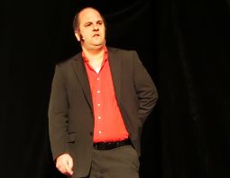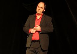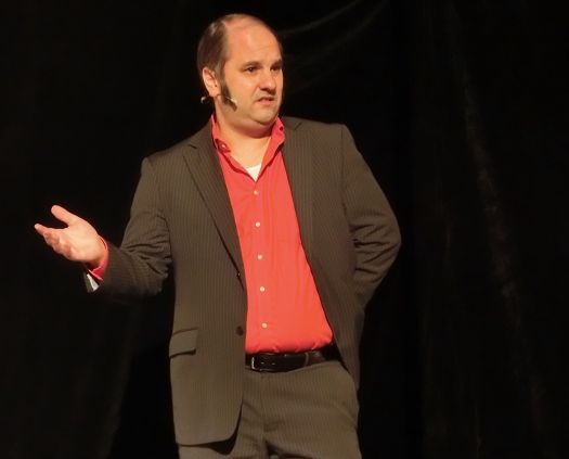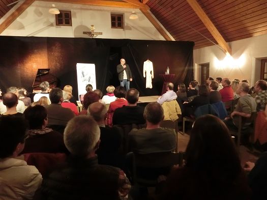 Der Anfang des Abends verlief etwas schleppend, als Matthias Egersdörfer mit fader Miene die Bühne betrat und von seinem Frühstück mit anschließender Kaffeevergiftung erzählte. Wenn er aber anfängt, ins Fabulieren und Fantasieren abzutriften, Erinnerungen der Kindheit mit Alpträumen zu vermischen, wird er nicht nur temperamentvoller sondern auch witziger, manchmal allerding auch derb und vulgär. Ein lautes Schnäuzen einer jungen Zuschauerin nimmt er zum Anlass. immer wieder direkt die Leute aus den ersten Reihen anzupflaumen, mal lustig, mal grob - manchmal aber auch an der Grenze des guten Geschmacks. Da wird eine Ecke der Zuschauer kurzerhand zu der "Naziecke" gemacht, nur weil sie bei einer Erzählung über ein verbranntes Buch gelacht hatten. Die, die nicht lachten, zählen zur "TAZ Fraktion", die um die junge Schnäuzerin zu den "Versehrten". Grenzwertig auch, als er eine junge rothaarige Frau ansprach, im Mittelalter seien solche auf den Scheiterhaufen gekommen, "verantwortet von jenen wie der da" mit Blick auf den Pfarrer. Das war doch einigen Besuchern etwas zuviel. Etwas stockend wird er immer wieder, wenn er von der direkten Zuschaueranmache in das Programm zurückkehrt.
