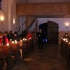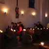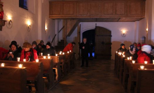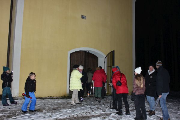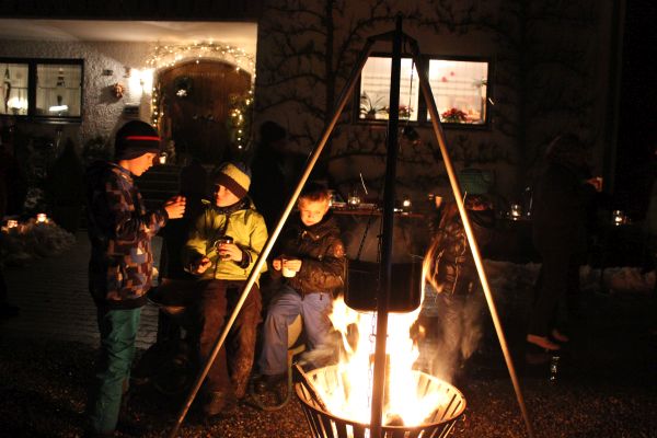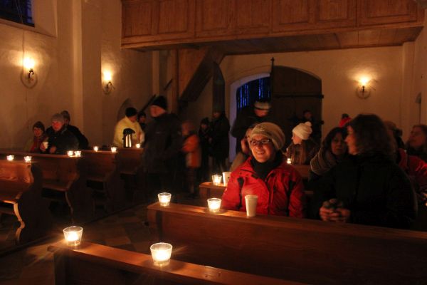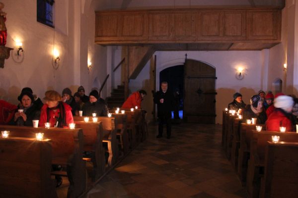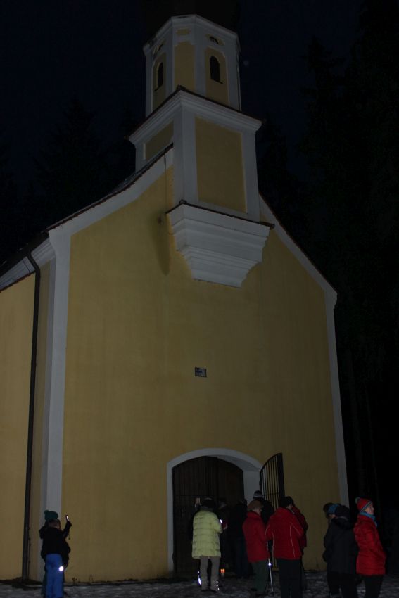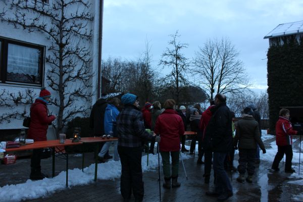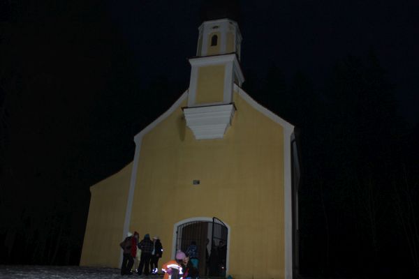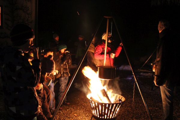 Schließlich am Ziel angelangt, erwartete die Wanderer das mit Kerzen wunderschön erleuchtete Waldkirchlein „St. Simon“, wo man, wohlig warm mit Tee gestärkt, eine kurze Andacht hielt. Mit Fackeln und Taschenlampen machte man sich schließlich wieder auf den Weg Richtung Pötzmes. Mit Punsch und leckeren Broten ließ man den Abend am offenen Lagerfeuer gemütlich ausklingen.
