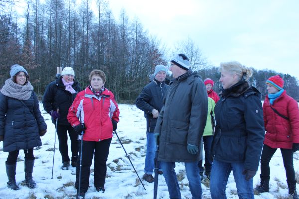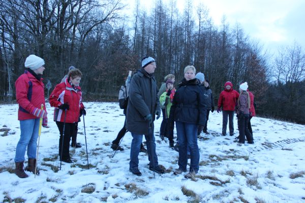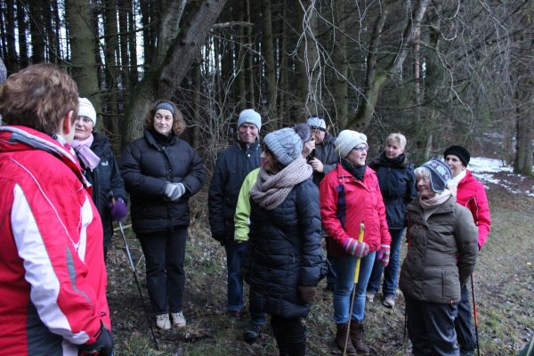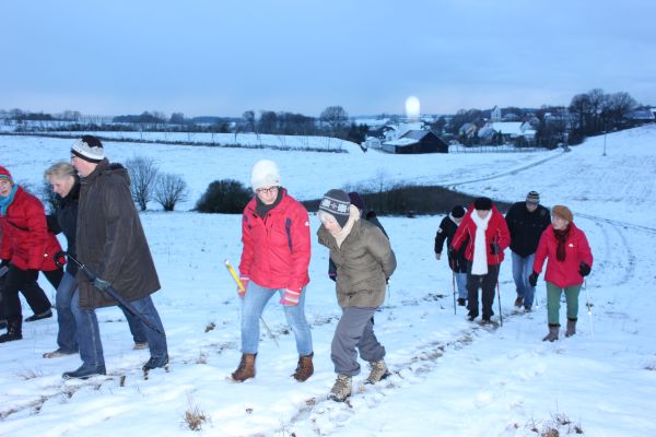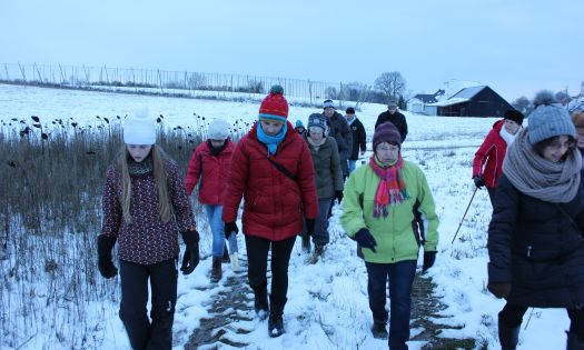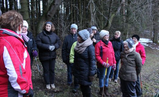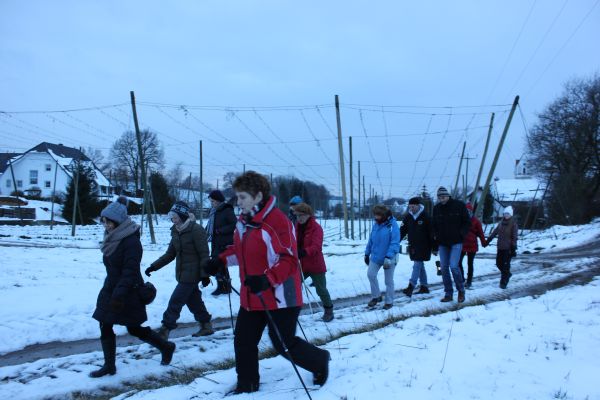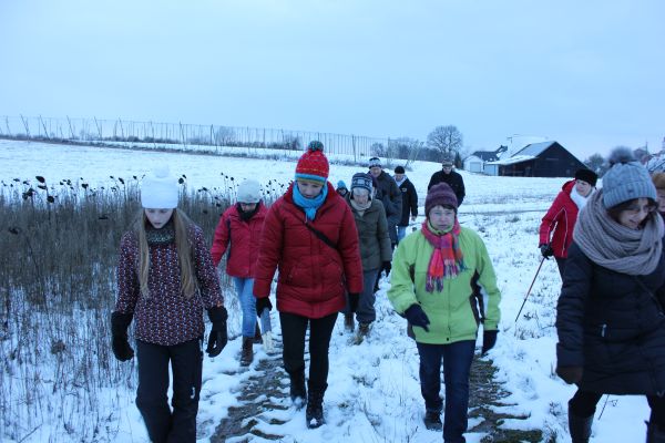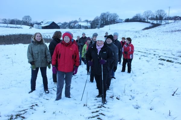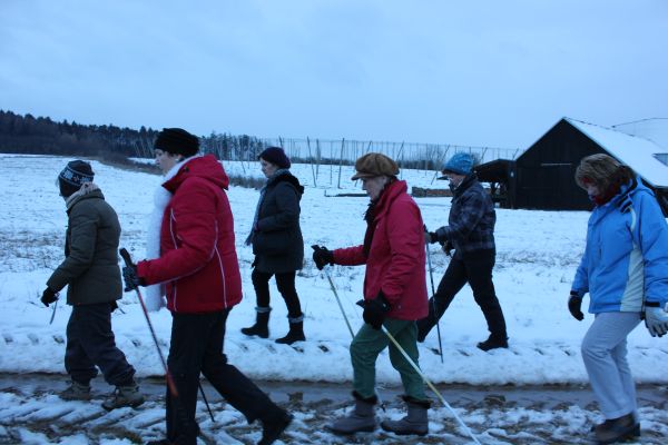 Auch wenn es die Schneedecke schon etwas zu schmelzen begann, marschierten die Teilnehmer gespannt über alte Flur- und Wanderwege, geführt von Anni Wimmer, in eine dennoch zauberhafte Winterlandschaft. Immer wieder lud die Organisatorin die Teilnehmer zum Innehalten und Momenten der Stille ein, um die raue Schönheit der Hallertauer Urlandschaft auf sich wirken zu lassen.