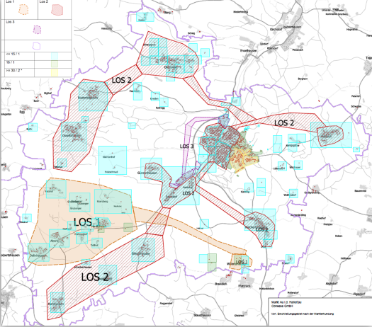 In Sachen Breitband wurden ja schon einige Runden gedreht. Das bereits laufende alte Verfahren wurde gestoppt und aufgrund höherer Fördermittel ein neues Verfahren gestartet. Dipl. Ing. Michael Räbiger von der Firma Corwese wurde erneut zur Sitzung eingeladen und unterbreitete das Ergebnis. Insgesamt waren 3 von 4 Anbietern aufgefordert worden ein Angebot abzugeben. Darunter die Firma Inexio(P2-Systems), NGN und Telekom. Eingegangen sind aber nur Angebote von NGN und der Telekom. Das Erschließungsgebiet wurde in Lose unterteilt (siehe dazu Bild oben)und Einzellosangebote, sowie ein Gesamtangebot von NGN und Telekom wurden verglichen. Letztendlich kam es aber günstiger nur die Gesamtangebote zu vergleichen und dabei ging eindeutig die Telekom mit einer Endsumme von 191.216 EUR als Sieger hervor. Davon entfallen nach Abzug der Fördersumme für den Markt Au Kosten in Höhe von 57.364,80 EUR.