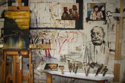 Oben im großen Flur hat jemand einen Schrein für David Bowie aufgebaut, nebenan unterhalten sich Künstler vertieft über Farben, von unten dringt Musik aus einem Übungsraum und dazwischen lugen interessierte Besucher, Freunde und Gäste in die Räume, naschen Gummibärchen und trinken Wein.