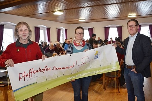 Das Aktionsbündnis „Pfaffenhofen an der Ilm summt!“ wurde von dessen beiden selbst imkernden Koordinatoren, Künstler Manfred „Mensch“ Mayer und Biologin Kathrin Euringer, vorgestellt. Mit der Initiative soll in der Stadt Pfaffenhofen aber auch im gesamten Landkreis um Unterstützung der Wild- und Honigbienen geworben werden. Mayer und Euringer warben bei den Imkern darum, naheliegenderweise selbst dem Bündnis beizutreten. Dafür sei lediglich ein einmaliger symbolischer Obolus in Höhe von einem Euro notwendig und ansonsten mit keinerlei Verpflichtung verbunden, so die Koordinatoren.