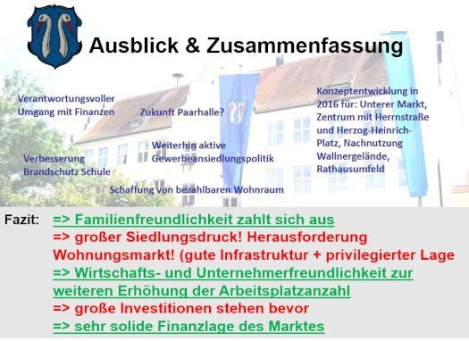 Auf der Agenda für 2016 stehe unter anderem der Erschließungsabschluss für das Baugebiet Schafberg II, der Neubau der Aussegnungsstätte Langenbruck, der Ausbau des schnellen Internets und der Start der Umsetzungsplanung für die Städtebauförderung - „Hauptprojekte sind dabei: Neugestaltung Ortskern mit Herrnstraße-Herzog-Heinrich-Platz und Johannisstraße; Bebauung des Unteren Marktes mit einem Haus der Begegnung inklusive Bücherei; Entwicklung eines Konzepts für die Erlebbarmachung der Paar-Auen“ -, die Erhöhung des Hebesatzes für Grundsteuer A und B an den gesetzlich festgelegten Nivellierung-Hebesatz, weiterhin eine aktive Gewerbeansiedlungspolitik und der Bau der Mensa.