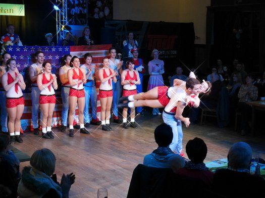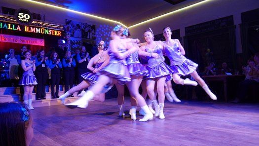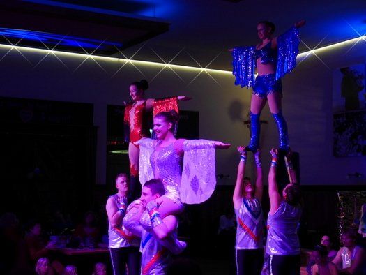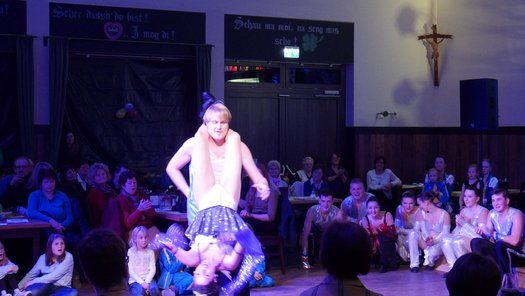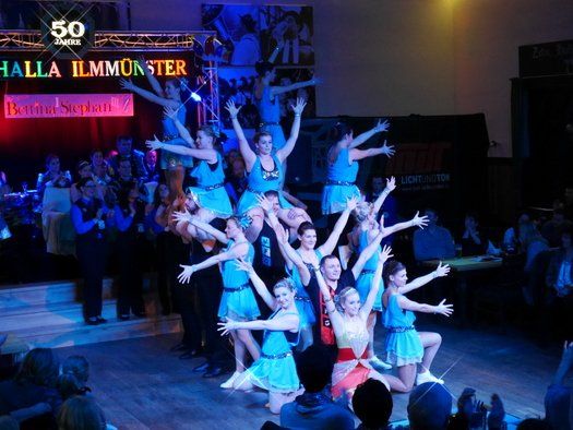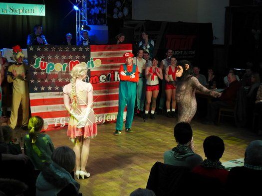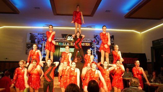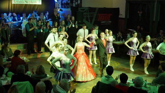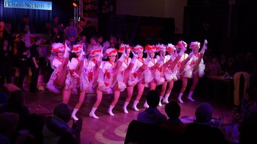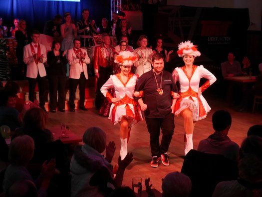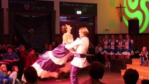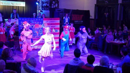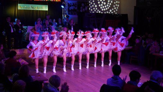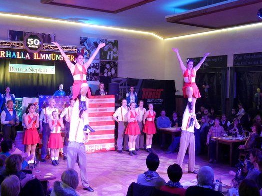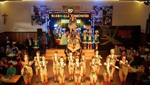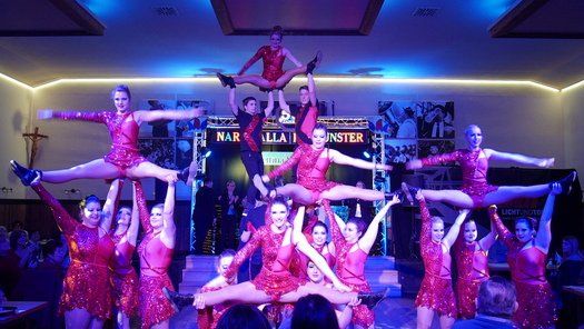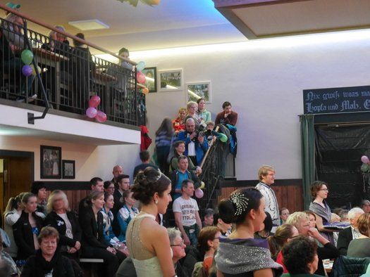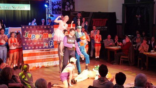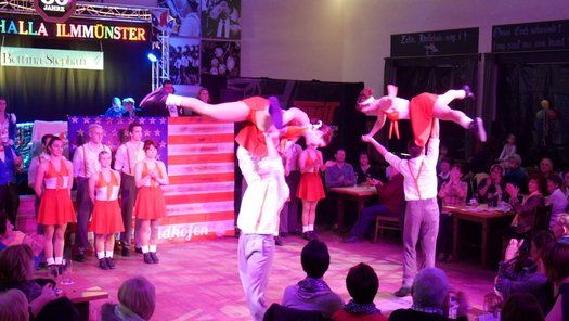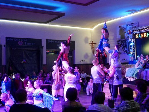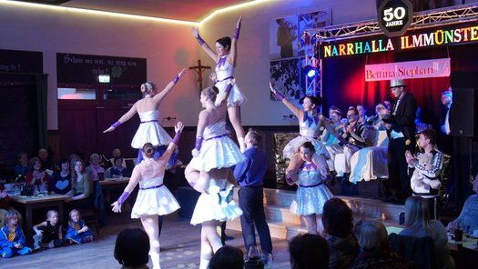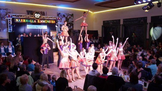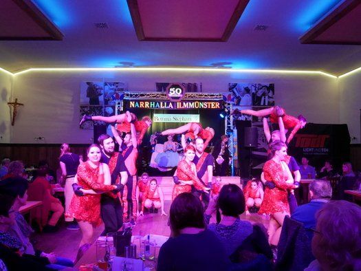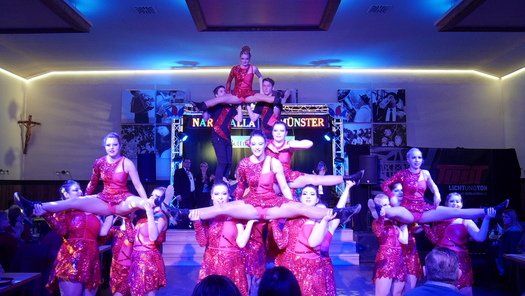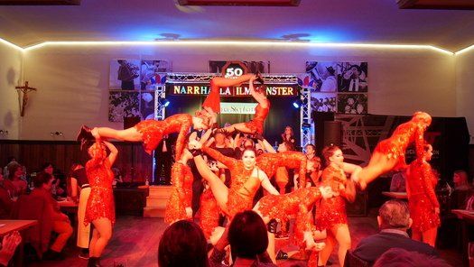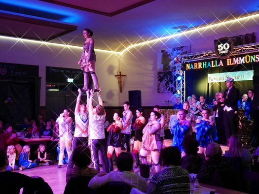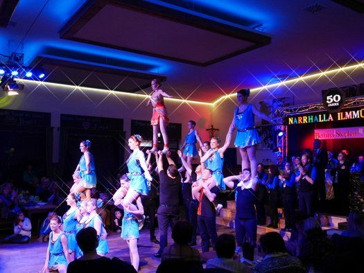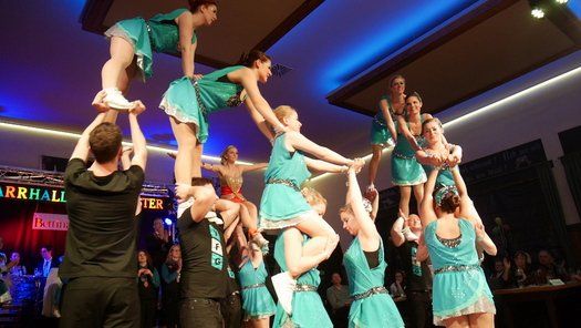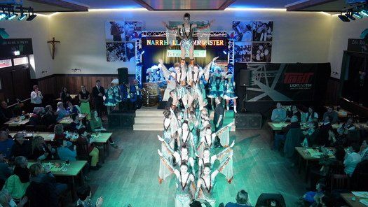 Schön langsam werden die Abläufe, auch in wechselnder Besetzung, perfekt, der Fasching könnte ruhig länger dauern. Wie gesagt, ein wunderbares Treffen der Faschingsdamischen zum 50. Geburtstag des Gastgebers im Schrätzenstallersaal. Selbiger wird als Auftrittsort immer wieder gerne genommen, erlaubt er doch ob seiner Höhe, gar dreistöckige Menschenpyramiden.