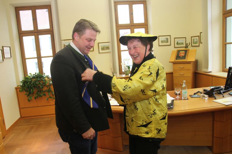 … und ab war sie! Mit einem schnellen Schnitt war die Krawatte von Bürgermeister Jens Machold nicht nur um ein gutes Stück kürzer, nein viel mehr übernahm auch Wolnzachs dritte Bürgermeisterin von diesem Zeitpunkt an das Regiment und läutete auch in Wolnzach die närrische Zeit ein.