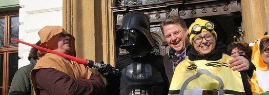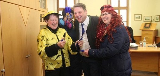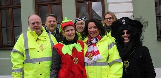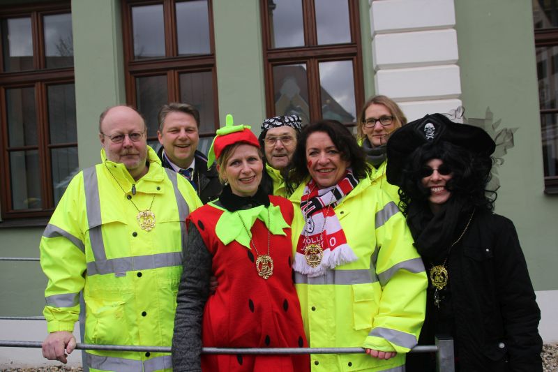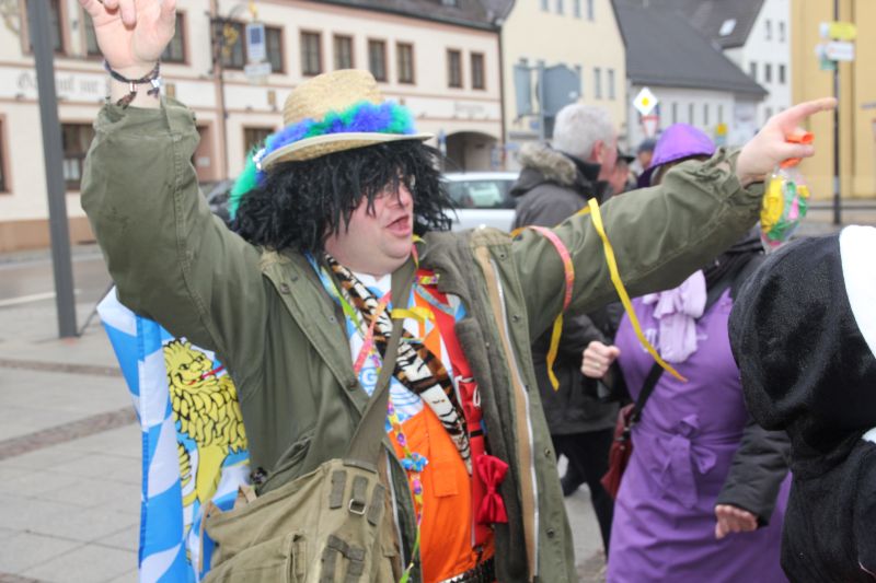 Gemäß dem Motto „Narrheit gibt Freiheit“ wurde die Amtsstube kurzen Hand auf den Rathausplatz verlegt. Dort hatten sich auch bei eher frostigen Temperaturen schon zahlreiche Jecken und Narren eingefunden, um es so richtig krachen zu lassen. Bunt, schräg und auch ein bisschen schrill waren die Kostüme, in denen die Wolnzacher gekommen waren, um den unsinnigen Donnerstag in Wolnzach standesgemäß zu beginnen. Von einem Lichtschwert schwingenden Darth Vader bis hin zu Bob Marley war alles vertreten. Und so wurde anstatt Anträge in den Amtsstuben bearbeitet, doch lieber gemeinsam mit den Wolnzachern gefeiert.