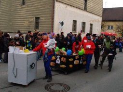Gespannt wurde der Faschingszug vor allem von den Kindern erwartet, sie freuten sich mit großen Tüten bepackt auf die vielen Bonbons. An geeigneten Mottos mangelte es in Au diesmal wieder nicht. Bürgermeister Karl Ecker musste herhalten was das „Biberproblem“ in Au betrifft, oder das fehlenden Geschirr in der Küche der Hopfenlandhalle, „die nicht kochen kann“.