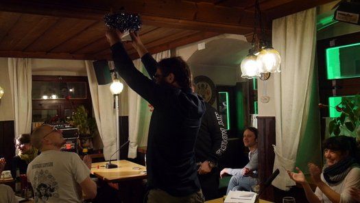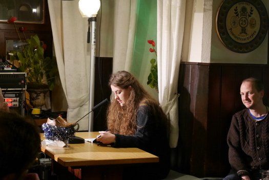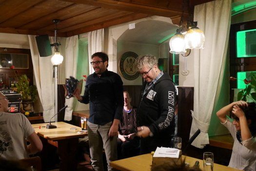 Barbara Jonasch aus Nürnberg (zweiter Platz), beschrieb das Innenleben eines Roboter-Eichhörnchens mit einem eingebauten Gut-Böse-Schalter aus einer parallelen Pappwelt, auf der Suche nach Macht und Ohnmacht in der Haselnuss, sehr DADA aber auch leicht und spannend. Lucia Pobitscha blitzte mit einem kurzen, kompakten Text der „Erbauung“ so schnell von der Lesebühne, dass die Fortsetzung schon fast ein Muss ist.