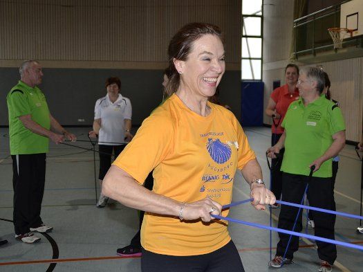 Organisiert von DJK-Ausbildungsreferentin Jeanne Graf de Vergara trafen sich unter Leitung von Doris Liebl, DJK-Übungsleiterin für Gesundheitssport, mehr als ein Dutzend Interessierte zum Faszientraining (Eine Trainingsmethode zur gezielten Förderung muskulären Bindegewebes) mit Tubes und Bändern aller Art.