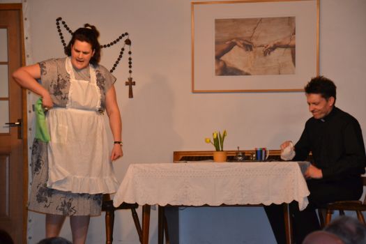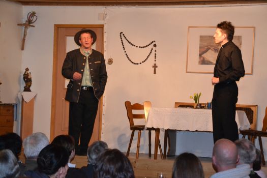 Das nach der Pause etwas längere Theaterstück, der Einakter "Pfarrhausg´schichten" - oder "Kleine Sünden bestraft der liebe Gott sofort" war dann schon "echtes" Theater. Da hatte der Bürgermeister eines Dorfes einer jungen Münchner Kellnerin in einer Bar sehr viel versprochen, sogar ein eigenes Appartment, wenn sie doch nur lieb zu ihm sei und in genau dieses junge Madel hatte sich der Sohn des Bürgermeisters verliebt und sein Vater war natürlich strikt gegen diese Verbindung.