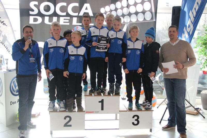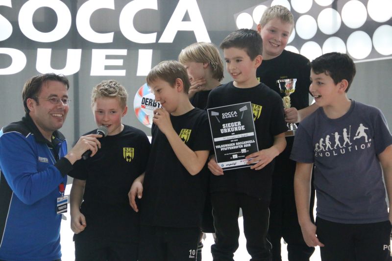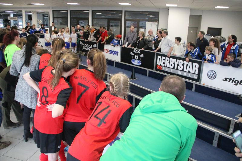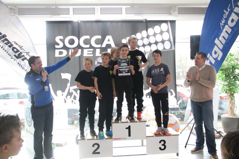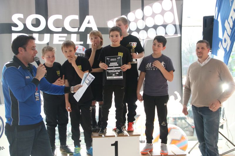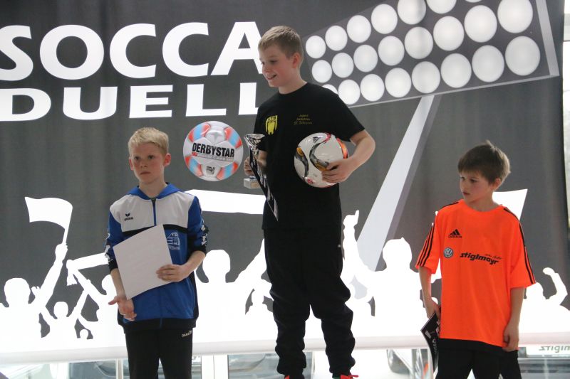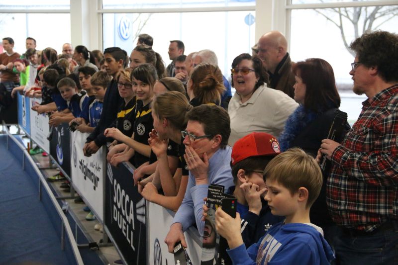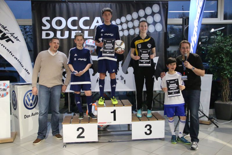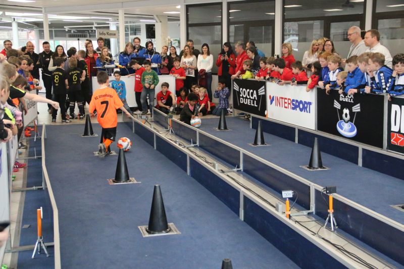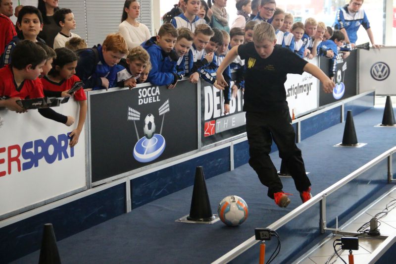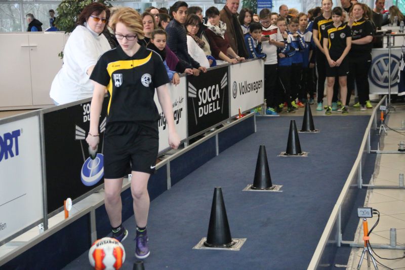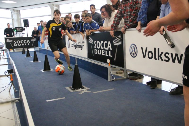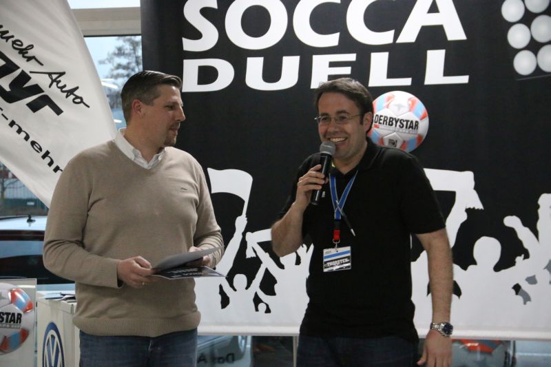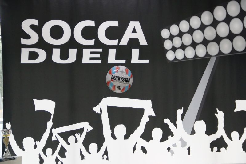 Beim SoccaDuell geht es darum, mit dem Ball am Fuß möglichst schnell einen Parcours zu bewältigen, auf dem 5 Pylonen aufgestellt sind. Auf dem Hinweg geht es dabei noch - vergleichsweise einfach - geradeaus an den Pylonen vorbei; zurück heißt es dann jedoch: Slalom um die Hütchen herum. Aufpassen muss man, denn es darf kein Hütchen ausgelassen, aber auch keines umgestoßen werden. Die bewusst eng gehaltene Bahn, die lautstarke Anfeuerung durch die eigenen Fans hinter den Banden und last but not least die eigene Grundnervosität galt es für jeden Einzelnen in den Griff zu bekommen.