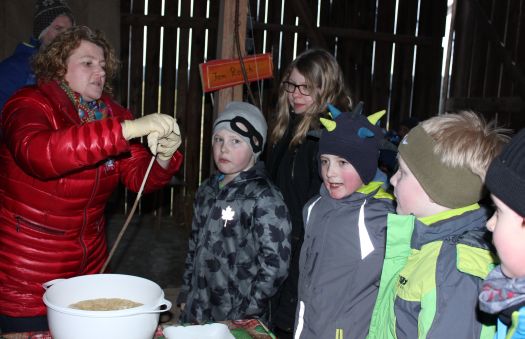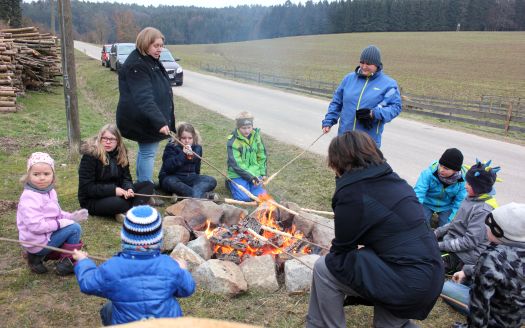 So gestärkt machte sich die ganze lustige Gesellschaft auf den Weg zurück in die Scheune. Dort wartete Helmut Resch bereits mit seinen frisch gegrillten Würstln auf alle Hungrigen. Elisabeth Resch hatte zudem extra noch Teig für Stockbrot gemacht, das am offenen Lagerfeuer von Groß und Klein auf einem Spieß „gegrillt“ wurde.