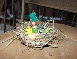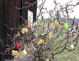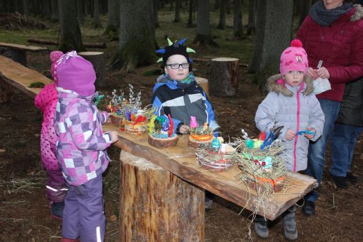 In großen Körben trugen die Kinder das ganze Handwerkszeugs wie bunte Farben, Heu, Palmzweige, Federn, Bänder, Deko-Hasen und weiße Eier zum Bemalen in den nahen Wald. An Baumstümpfen, die als Basteltische dienten, machten sich die Kleinen sofort mit Feuereifer an die Arbeit.